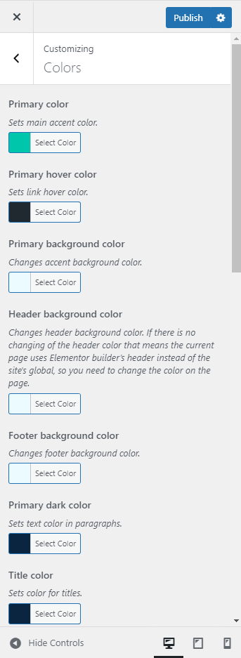 Button hover color – sets hover color for buttons. To change Elementor button colors go to Elementor Color Customization section below.